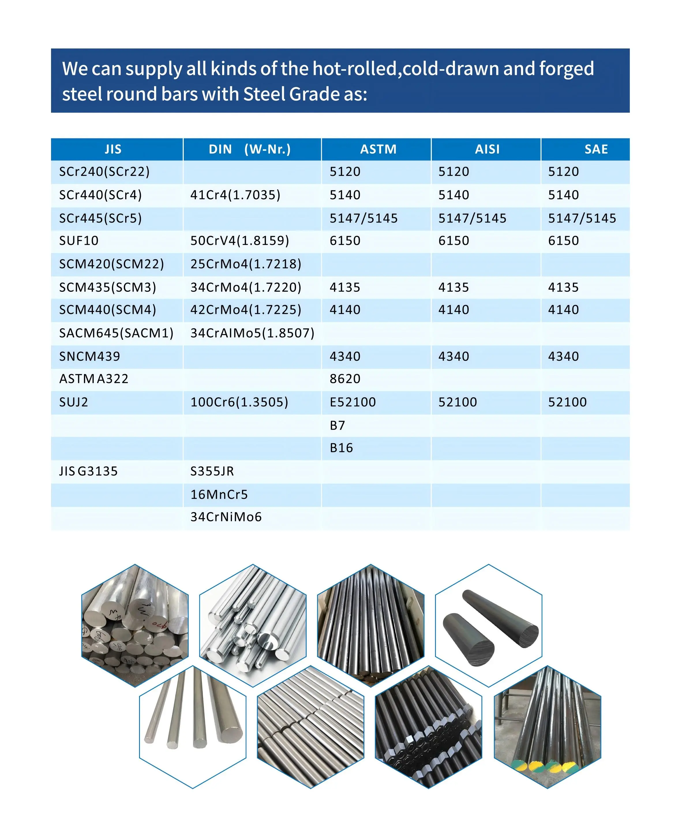 We can supply all kinds of hot-rolled, cold-drawn, and forged steel round bars with Steel Grade as: