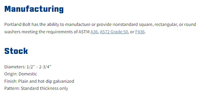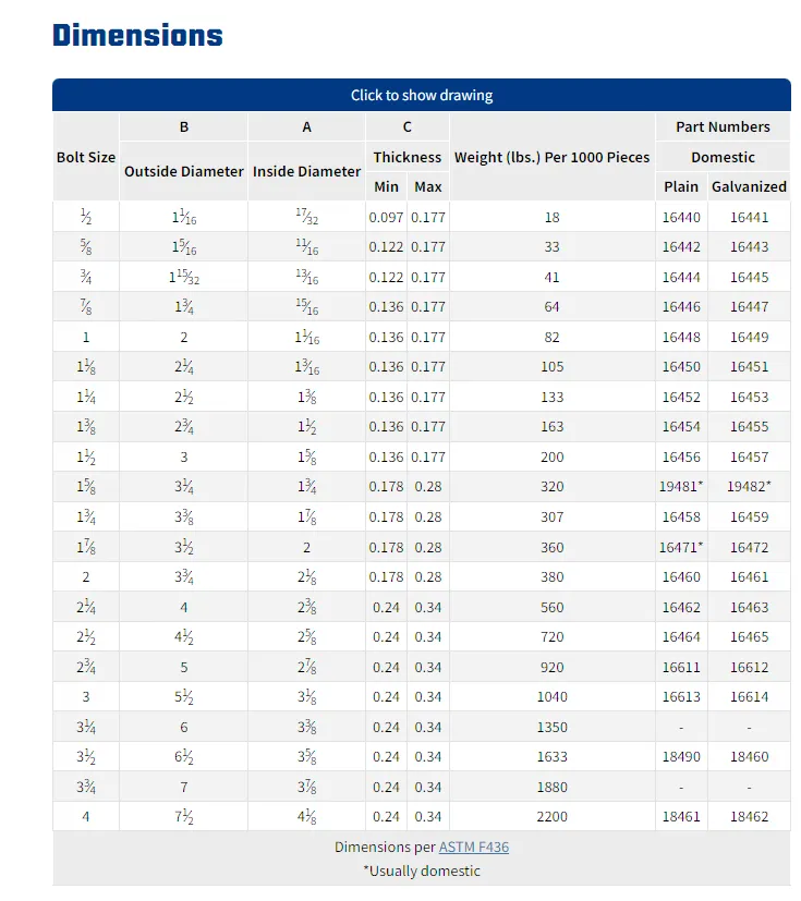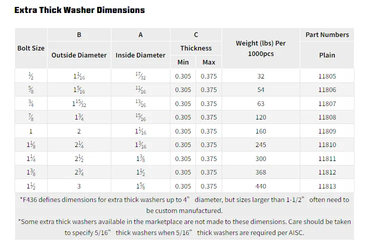 Washers provide a smooth bearing surface and are used under the head of a bolt and/or a nut. The chemical, mechanical, and dimensional requirements for hardened washers are covered under the ASTM specification F436. These washers are through hardened or carburized to add strength, but are physically smaller than a standard F844 flat washer. They are the recommended washer for any fastener other than a low carbon steel bolt.