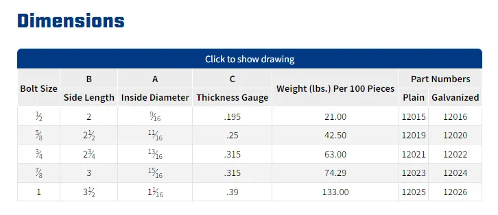 Square plate washers are made from low carbon steel and have a larger surface area than round washers. Since they develop more friction when tightened against wood, this type of washer is specified for seismic applications. They are often found in timber construction. Stock sizes are available for bolts from 1/2″ to 1″, with a thickness of .195″ up to .395″. For the best corrosion resistance, hot-dip galvanized plates are recommended. Complete dimensions are provided below.
